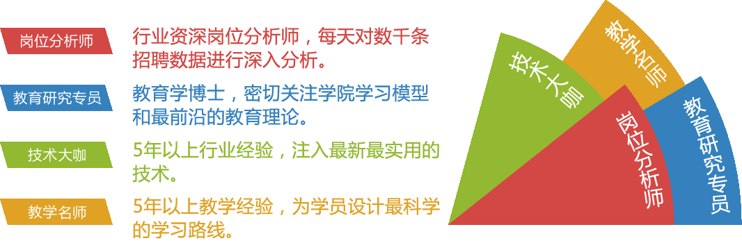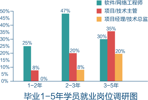 对近5年毕业学员的调研数据表明,学员毕业后的1-2年内,处于磨练期,只有少数技术扎实、适应能力强的学员能够走到工程师或者项目/技术主管的岗位,但是随着项目经验、社会阅历的的积累和增加,学员成为技术骨干和管理者的比例也大幅度提高,在毕业2-3年的时间内,47%的学员转变为工程师角色,20%的学员担任主管,8%的学员晋升为项目经理和技术总监职位,在3-5年的区域,担任项目经理和技术总监职位的比例已经提升至20%, 主管职位比例提升至35%。
