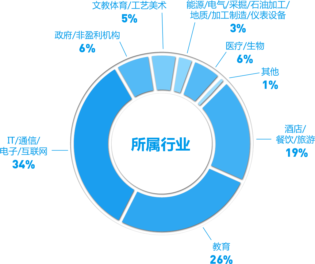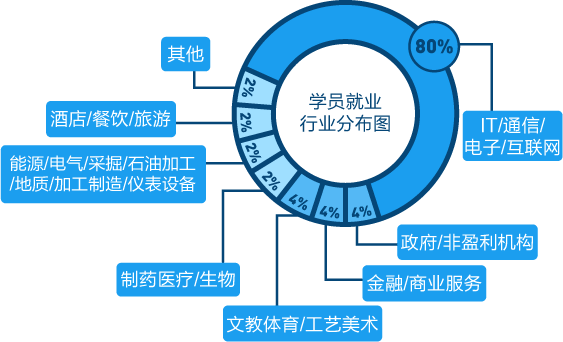 从就业行业分布图上可以看到,IT/通信/电子/互联网从业学员占本次统计人数的80%,在学员从业行业选择上独占鳌头,学员就业范围涵盖了目前就业市场提供就业机会的所有行业,说明毕业学员选择行业的自由度较高,可在自己感兴趣的行业从事IT相关岗位的工作,契合学员个性化的职业发展需求。
