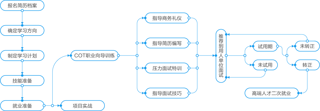 就业服务体系不仅帮助学员解决基本的就业问题,更关注已就业学员未来的职业发展,针对不同阶段的学员提供有针对性、个性化的就业服务,协助支持青鸟学员