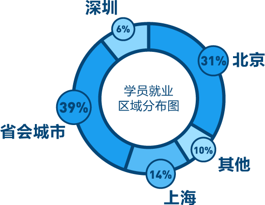 学员就业分布较为集中的区域为省会城市、北京、上海与深圳,其中省会城市就业比例为39%。上述统计结果表明,在IT行业发展迅速、产业链比较发达的北京、上海、深圳及省会城市,因为就业岗位需求的数量较多、薪资待遇较好,吸引了超过9成多的毕业学员选择在以上区域寻求个人发展。